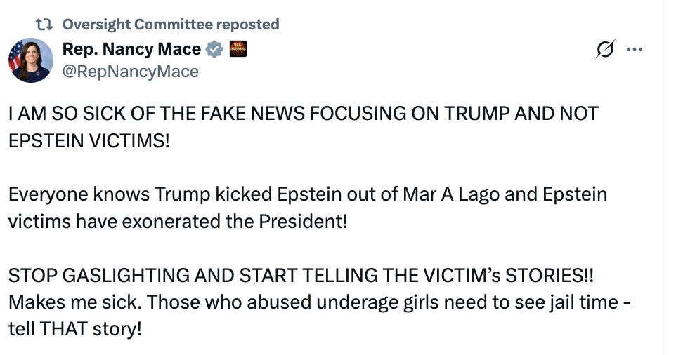 Nancy Mace makes the argument that since Trump eventually cut ties and we do not have specific information from a victim saying he raped them, he should not be involved in the conversation. “I AM SO SICK OF THE FAKE NEWS FOCUSING ON TRUMP,” she writes.