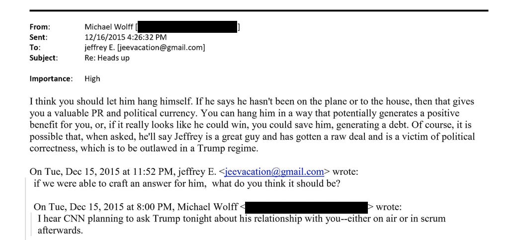 Later, Wolff said to Epstein, “If [Trump] says he hasn’t been on the plane or to the house, then that gives you a valuable PR and political currency.” This shows that Epstein had clearly contemplated using this information as blackmail.