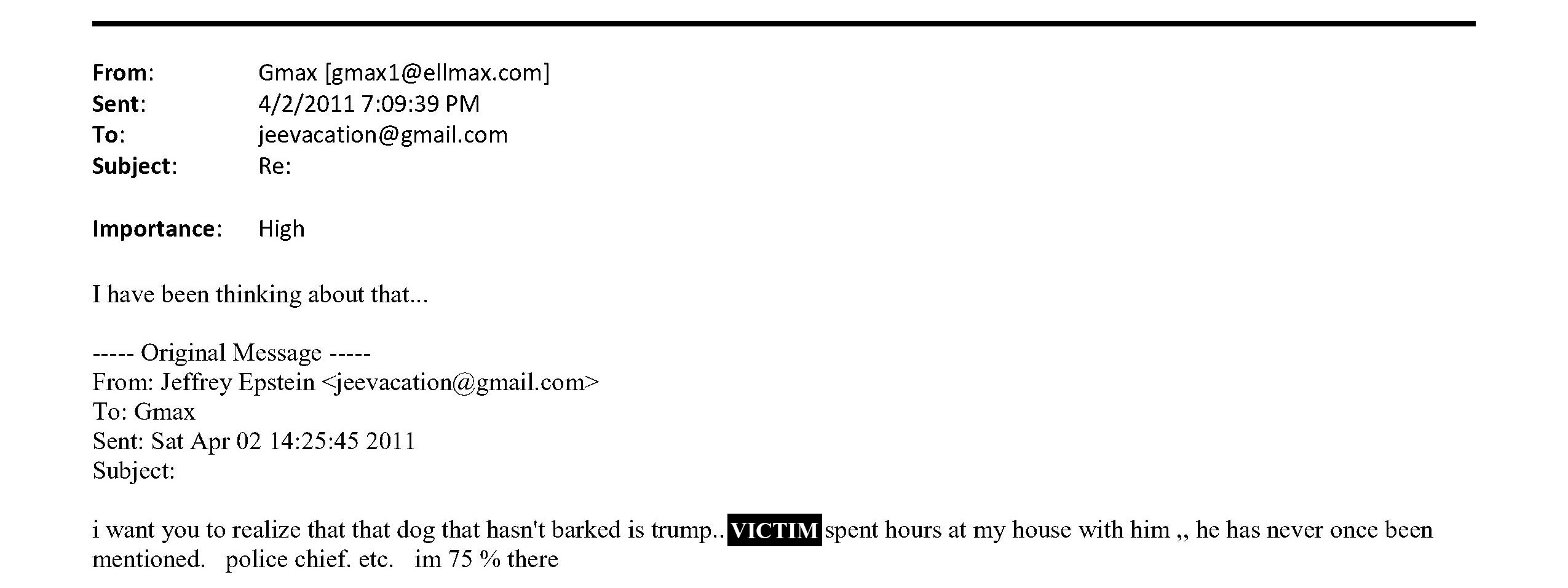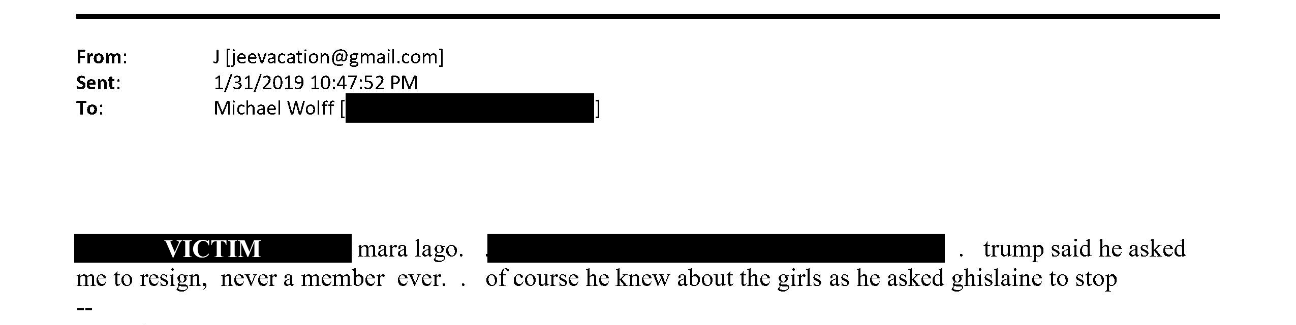 On Twitter, Republicans say the redacted name of the victim in the 3 email release is Virginia Giuffre. Virginia said in a 2016 deposition for a civil case that while she heard Trump had been in Epstein’s house, she hadn’t seen him herself.